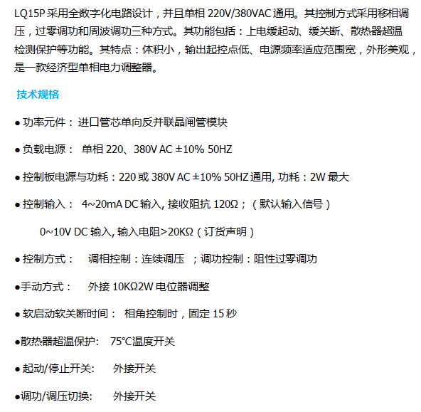 LQ15P-6-20-NN 含义:负载电源单相220、380V 通用,0~10V DC 输入,最大工作电流20A.